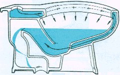 A toilet is a siphon. When you pull the handle, 1.5 gallons of water dump into the bowl at once. This causes water to fill up a tube with liquid that was formerly filled with air. That full tube of liquid then wants to pull all of the water in the bowl with it to the sewer. With the liquid gone, the tube fills with air again, and we break the siphon. A filler than fills the toilet bowl back up to the level high enough to catch feces, but not high enough to flush.